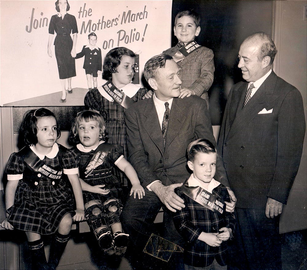 Liebman behind Supreme Court Justice William Douglas as Brooklyn banner boy for March of Dimes, early 1950s